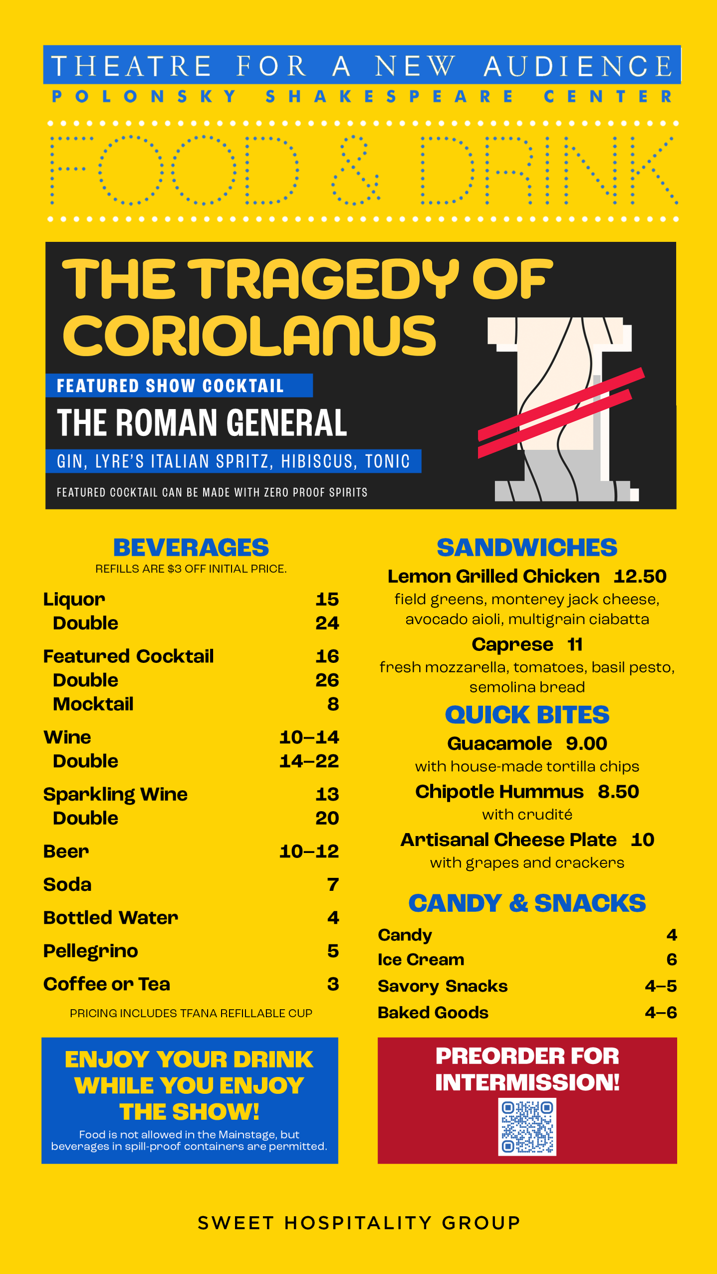 Located in the lobby of Polonsky Shakespeare Center, Food & Drink is brought to you by Sweet Hospitality Group (SHG), the premier theater concessions and catering company.
