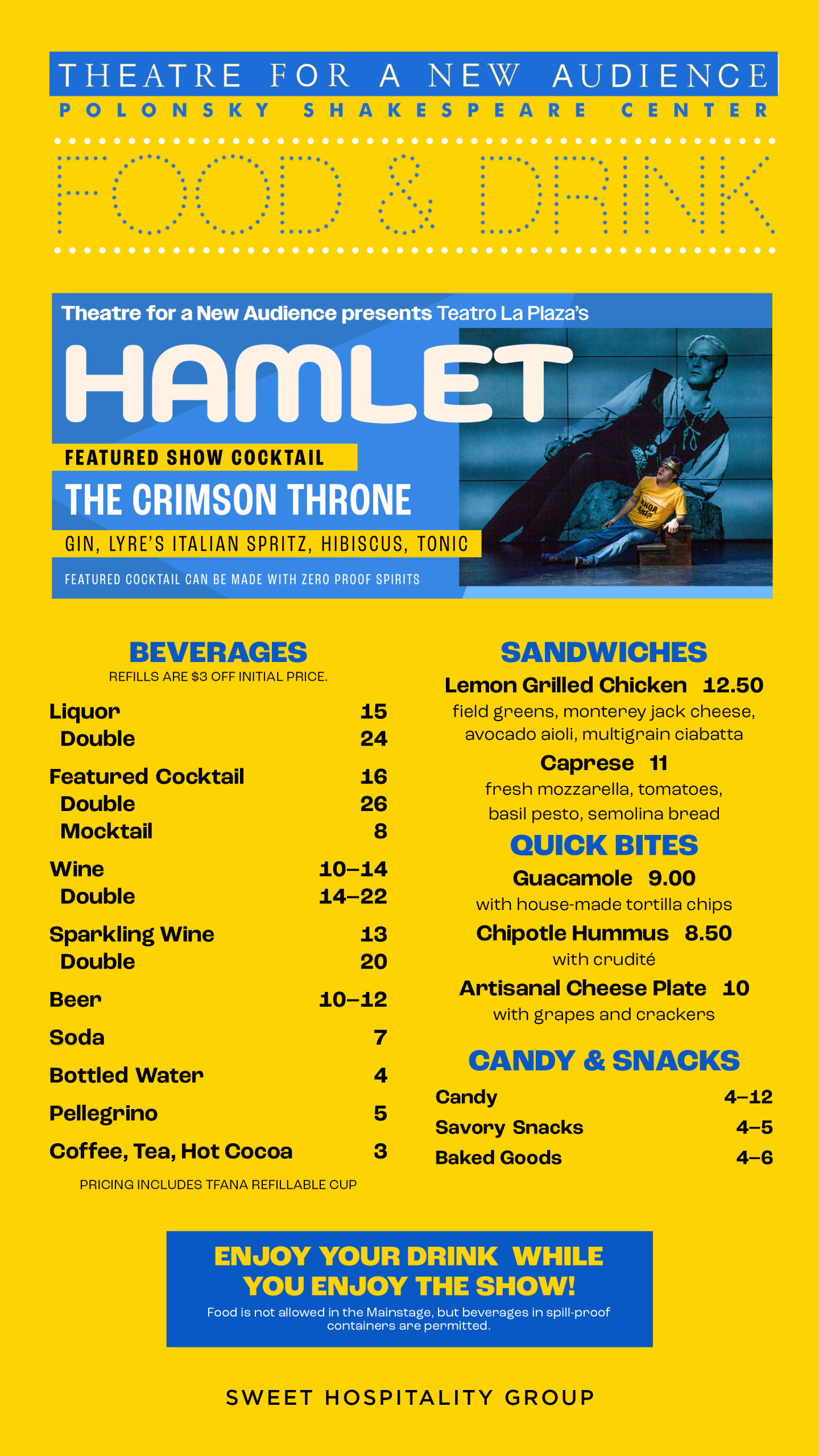 SHG’s signature brand of innovative offerings and inviting service can currently be found at 30 theaters in NYC and beyond. Food & Drink opens one hour prior to each performance and stays open through intermission.